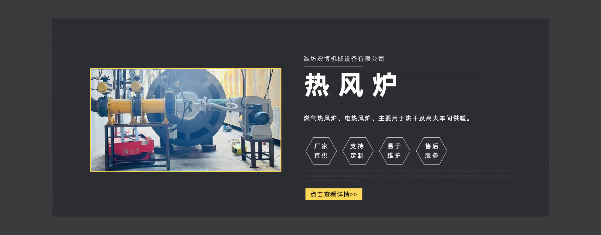 潍坊宏博机械设备有限公司是从事热风炉、烘干设备、供暖设备的研发、设计、制造和服务于一体的实体企业。长期以来,企业以市场的发展和客户的需求为导向,集多年的生产技术与经验为一体,不断开发和优良产品。